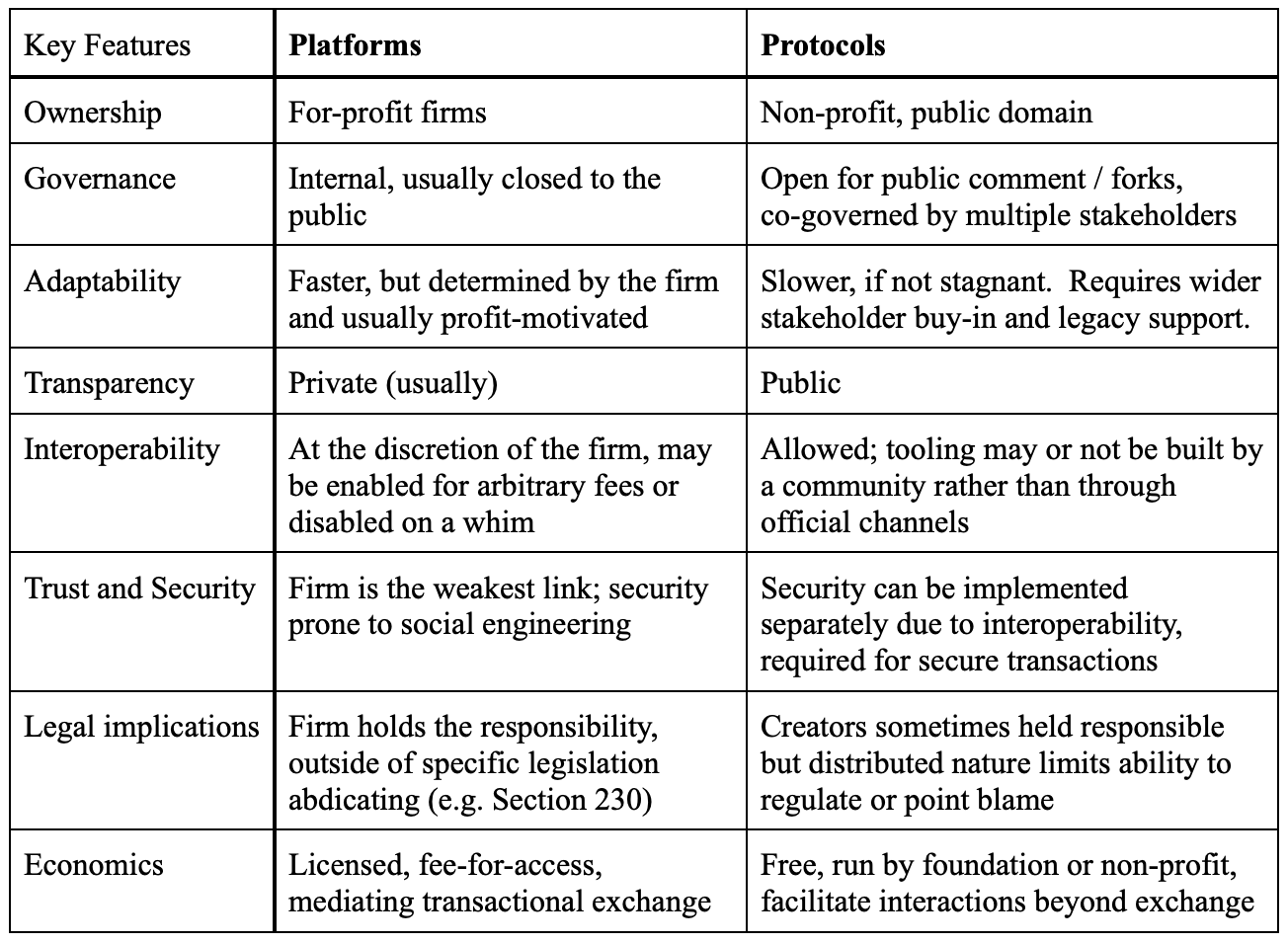 Building on this theoretical background, I conceptualize both platforms and protocols as infrastructures that facilitate interaction. The differences in these two forms stem from the patterns of governance that define them. Platforms are owned and operated by firms behind closed doors, protocols are typically governed transparently by foundations and not-for-profit organisations with open licensing. The distinctions between these governance forms yield starkly different outcomes for the people interacting via these infrastructures. We'll cover several examples, highlighting these differences and engaging with hypotheticals exploring the potential of protocols where platforms currently dominate. Through this framing and research, I hope to complement the current push for protocol-focused studies, as well as the literature on platforms and their economic behavior, and better understand where and why these forms exist in the greater economic landscape.